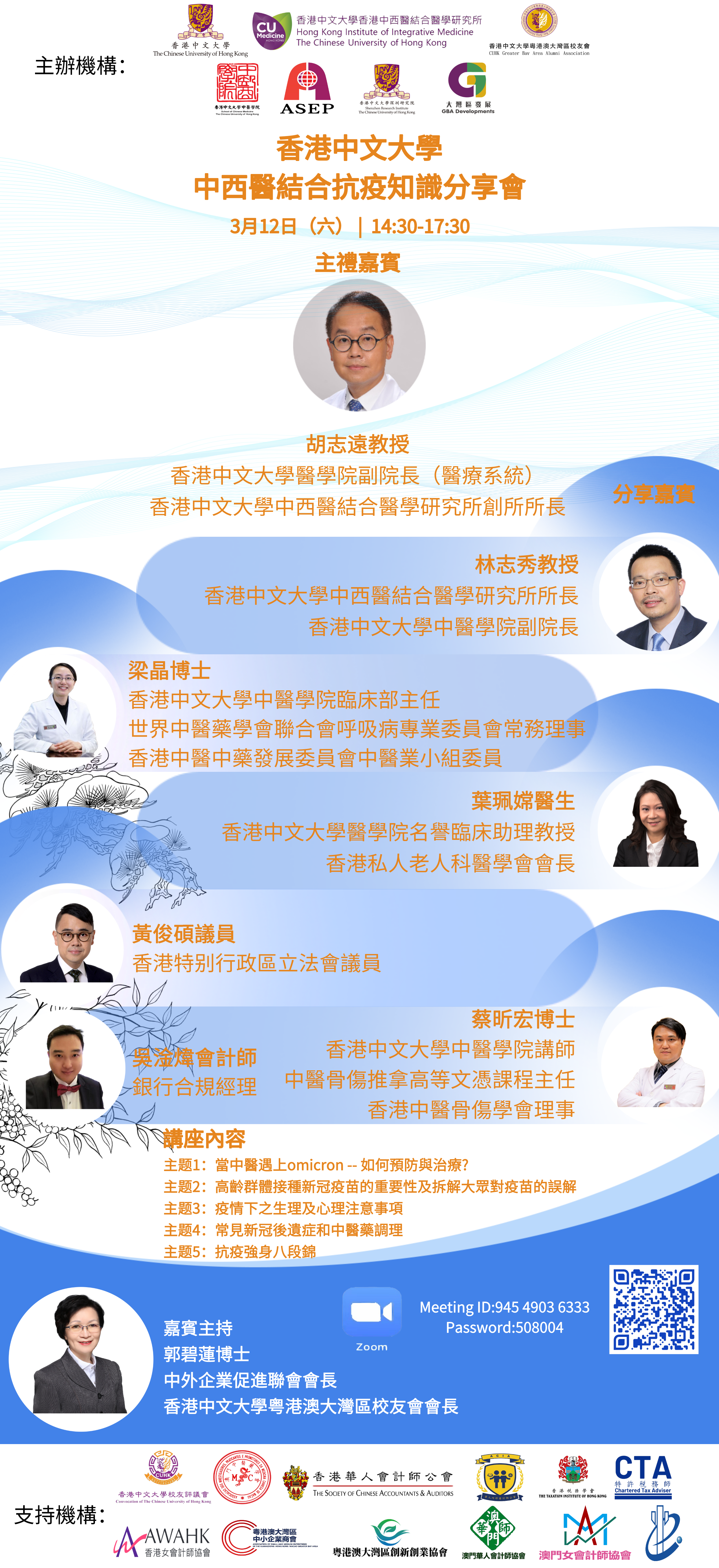 香港新冠疫情肆虐,第五波至今,疫情累計近五十萬宗確診個案,而且還有上升之趨勢。有見及此,香港中文大學中西醫結合研究所、香港中文大學中醫學院、中外企業促進聯會、香港中文大學粵港澳大灣區校友會、香港中文大學深圳研究院、及香港中文大學粵港澳大灣區發展辦公室,聯合舉辦「香港中文大學中西醫結合抗疫知識分享會」於3月12日(週六)下午 2:30-5:30以線上Zoom方式進行。