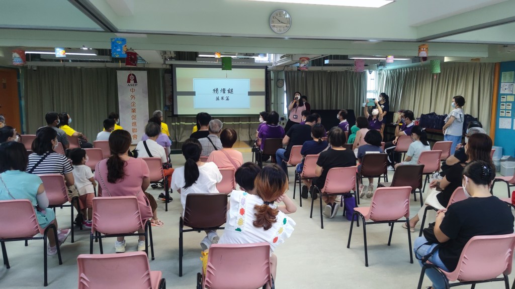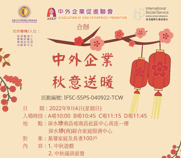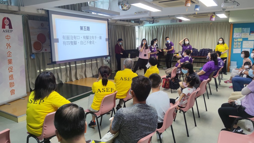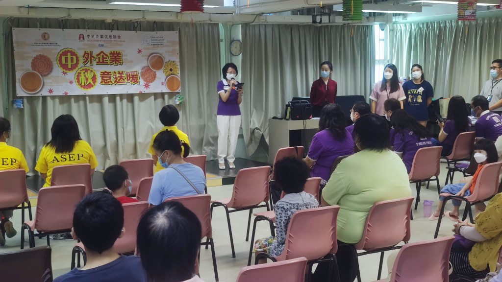 中秋社區服務活動 @ 深水埗 本會聯同香港國際社會服務社及中外企業促進聯會於2022年9月4日在深水埗南昌社區中心舉辦了一項名為「中外企業.秋意送暖」的社區服務活動,與該社區基層家庭及長者一同慶祝中秋佳節。活動包括中秋遊戲活動及派發中秋福袋。 當日活動照片: 會長郭碧蓮博士致辭 進入猜燈迷活動環節 司儀主持猜燈迷活動 參加者踊躍參與遊戲互動 參加者踊躍參與遊戲互動 派發福袋 活動大合照 合辦機構義工合照 本會義工合照 分享此文: 按一下即可分享至 X(在新視窗中開啟) X 按一下以分享至 Facebook(在新視窗中開啟) Facebook 喜歡 正在載入...