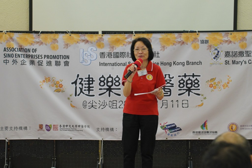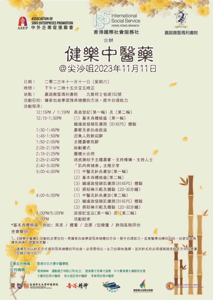 ISS國際社會服務社及中外企業促進聯會今年於2023年11月11日夥拍香港中文大學中醫學院和嘉諾撒聖瑪利書院的師生們,以及一些關愛長者的機構在尖沙咀區順利為該區基層長者講解養生之道、進行基本身體檢查及中醫義診等活動,藉此鼓勵長者多關注身心健康,學習強身健體的方法,提高保健知識及自理能力,讓他們更能擁抱豐盛晚年。本會獲邀成為支持機構之一,讓會員參與此項別具意義的社區服務。