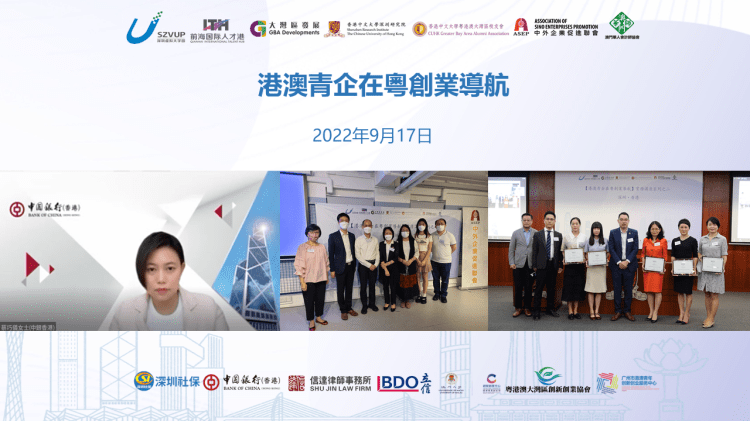 為協助港澳青年在粵創業,本會聯同香港中文大學深圳研究院、大灣區發展及中外企業促進聯會將舉辦一系列【港澳青企在粵創業導航】實務講座。本系列中的第二講已於2022年9月17日順利舉行,邀請了嘉賓分享與在大灣區開展業務相關的題材。