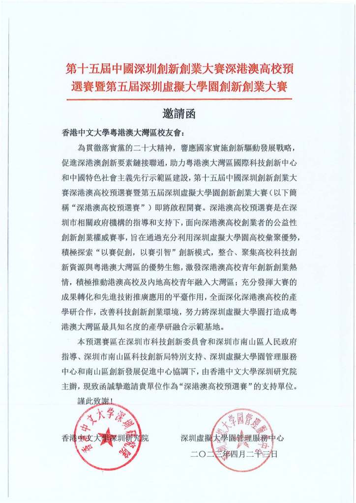 本會榮幸獲邀成為「第十五屆中國深圳創新創業大賽深港澳高校預選賽暨第五屆深圳虛擬大學園創新創業大賽」的支持單位。此活動由香港中文大學深圳研究院主辦,並得到深圳市科技創新委員會和深圳市南山區人民政府指導、深圳市南山區科技創新局特別支持、及深圳虛擬大學園管理服務中心和南山區創新發展促進中心協調。本會誠邀各會友鼓勵身邊青年朋友們支持本屆創新創業大賽,積極響應國家實施創新驅動發展戰略,發輝粵港澳大灣區的優勢生態,全面深化產學研合作,推動先進技術應用,實現大賽的成果轉化,推進深圳虛擬大學園成為區內最知名的產學研融合示範基地。