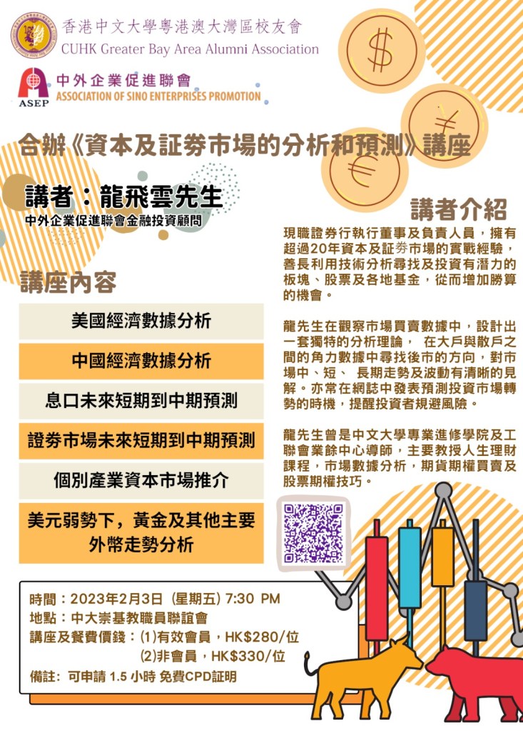 踏入2023年,隨着中國大陸與港澳地區開放口岸通關,新冠疫情陰霾終有消退迹象,各地經濟活動開始復蘇,但與此同時環球政局仍處於動盪時期、國際關係日趨複雜、大國博奕影響全球經濟及民生,再加上軍事衝突及經濟制裁讓全球能源及糧食供應鏈出現危機,國際物流受阻,多國通脹問題嚴重,導致湧現擺工及遊行示威浪潮,數據顯示多國經濟呈現衰退。各種市場不確定性讓不少投資者感到困惑。本次講座再邀來投資分析師龍飛雲先生,分享他對資本及証劵市場的分析結果和預測。歡迎感興趣的會員報名參加。